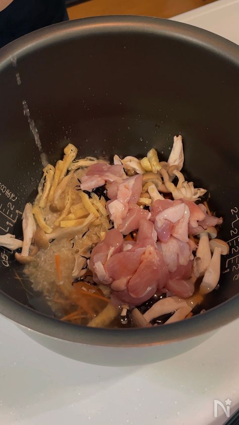 (1) 人参を千切り、油揚げを細切り、しめじは石付きを取り、手で割く。鶏モモこま切れ、乾燥ひじき、【A】と共に炊飯器に入れ、通常炊飯する。