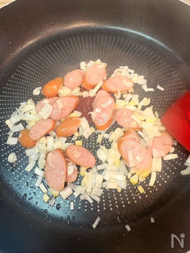 (3) フライパンにサラダ油を熱しウインナーとねぎのみじん切りを炒める。