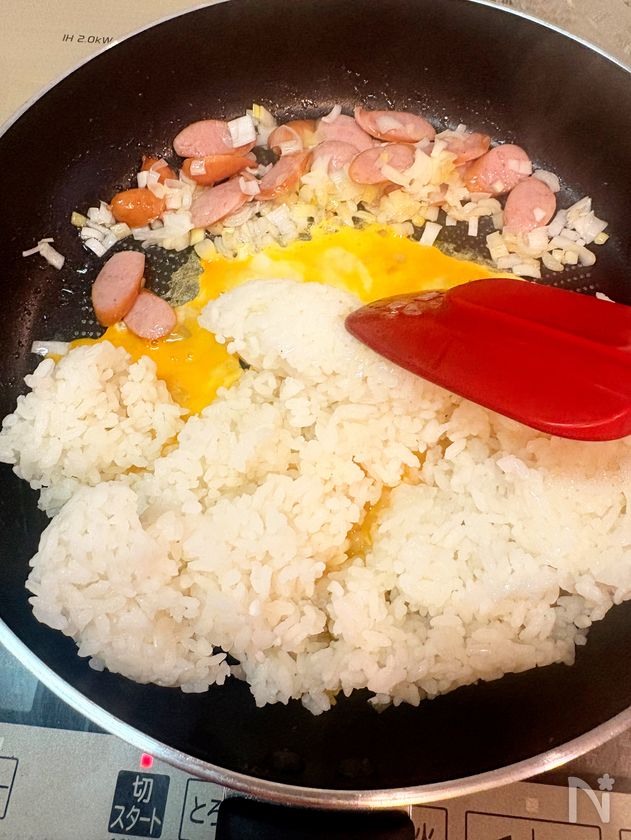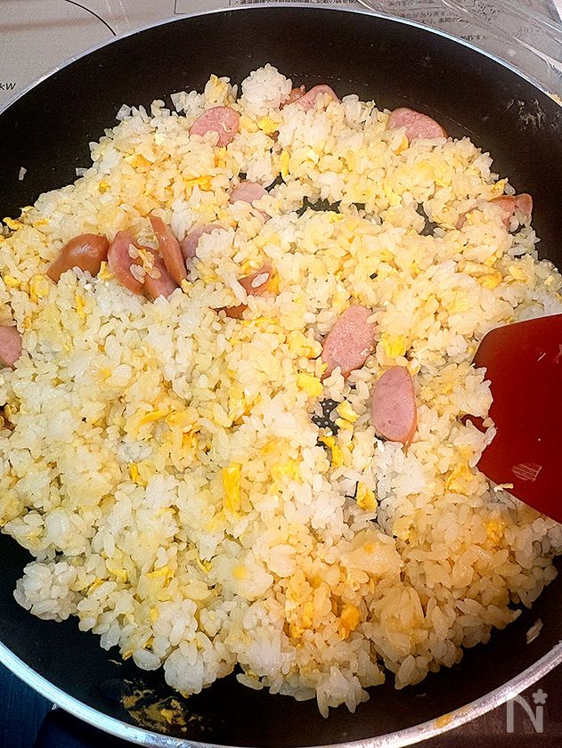 (4) ウインナーとねぎを端に寄せ溶き卵を入れ、すぐにご飯も入れよく混ぜ炒める。