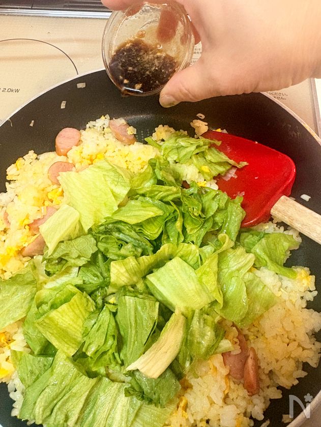 (6) レタスを入れ【A】で味付けたらよく混ぜる。