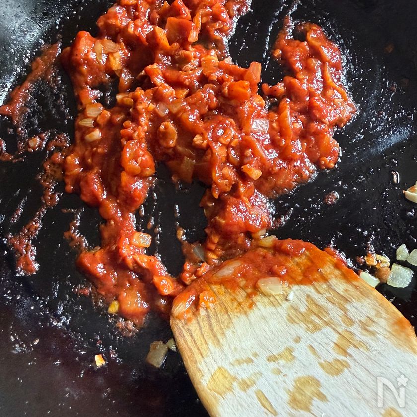 (3) 1で取り分けておいたトマトピューレを加え、水分を飛ばすように2分ほど炒め合わせる。