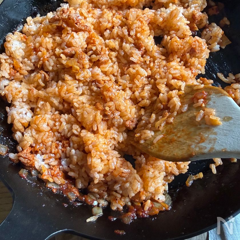 (4) 鍋を火からおろし、ご飯(冷めたものでOK)を加えて木べらで切るように混ぜ合わせる。
