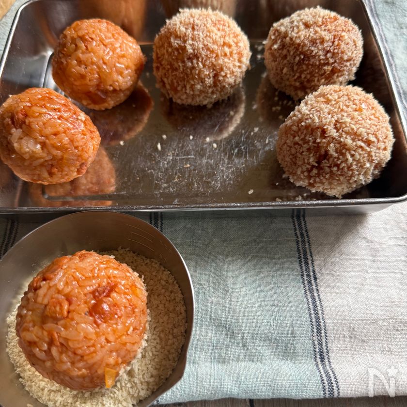 (6) 6個に丸めたご飯にパン粉をまんべんなくまぶす。