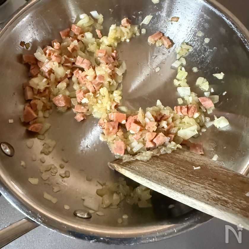 (1) 玉ねぎ、にんにくはみじん切り、ソーセージは5mm角に切る。