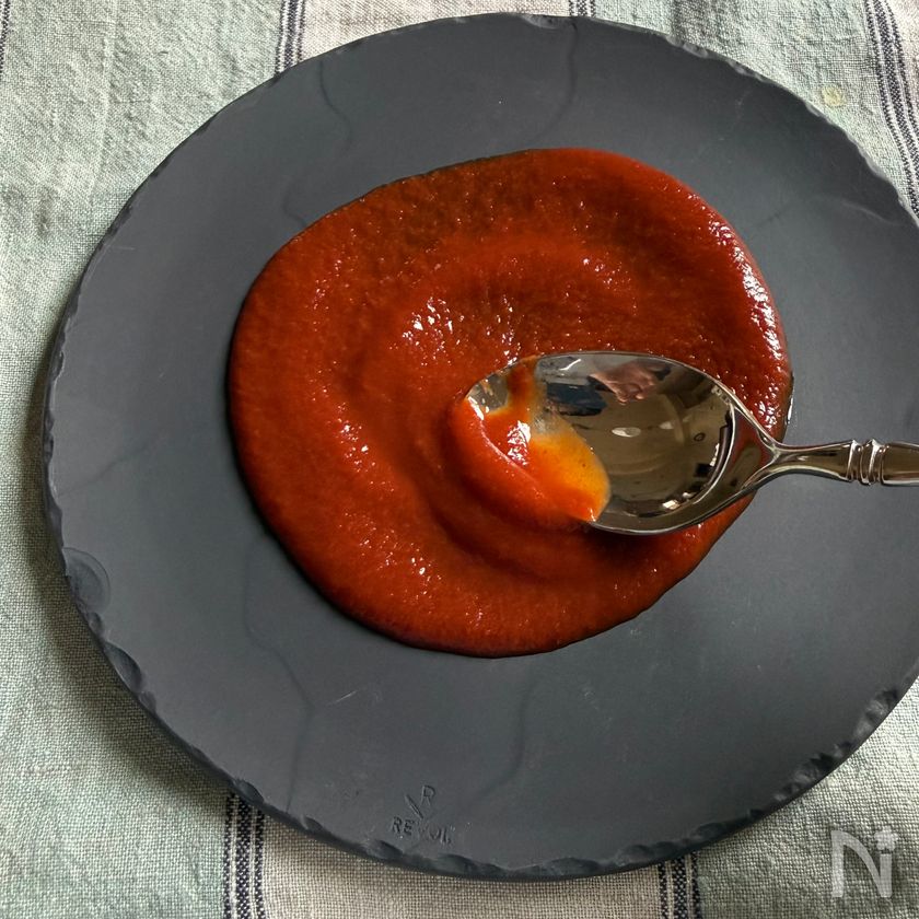 トマトピューレはソース用に大さじ4、残りをご飯用に取り分ける。