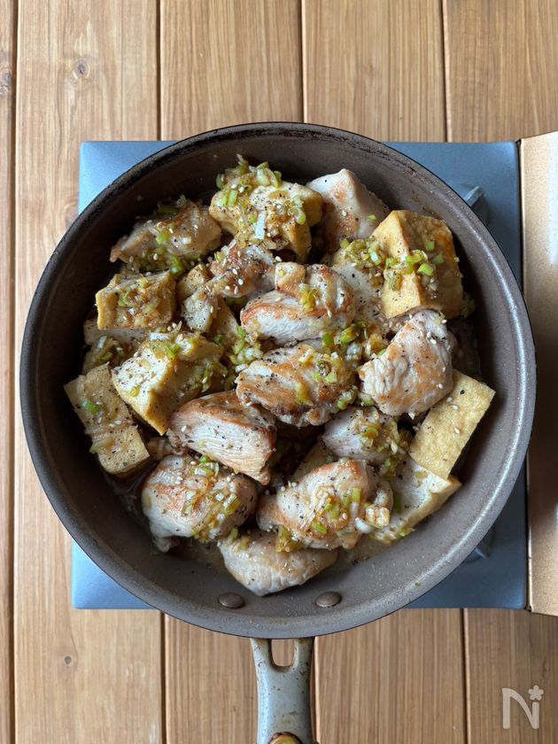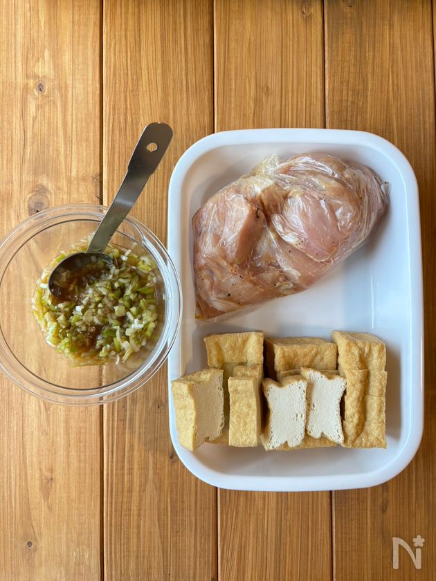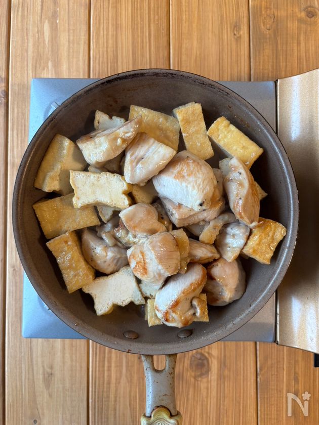中火で熱したフライパンにサラダ油を引き鶏むね肉を両面2分ずつ焼く。そこへ厚揚げを加えてさらに2分炒める。