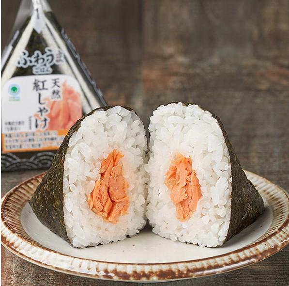 焼成時に炙り工程を入れ、鮭本来の旨味と香ばしさを味わえる紅鮭のほぐし身を包んだおにぎり。