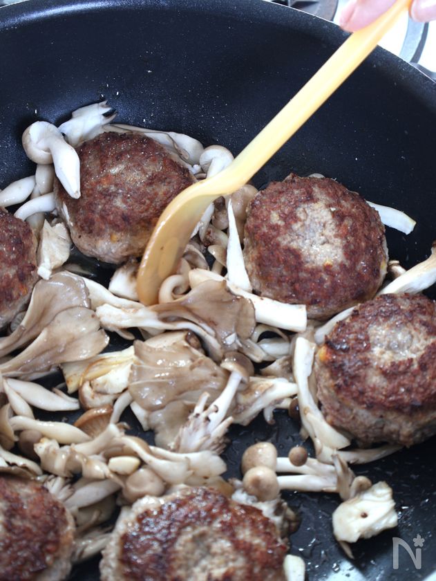 (4) フライパンの隙間にきのこ類を加え、ハンバーグから脂が出てきていないようならサラダ油(少量:分量外)を加え、中火の弱火にし、きのこに火を通す。