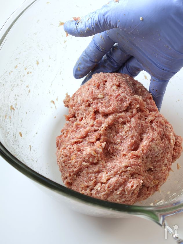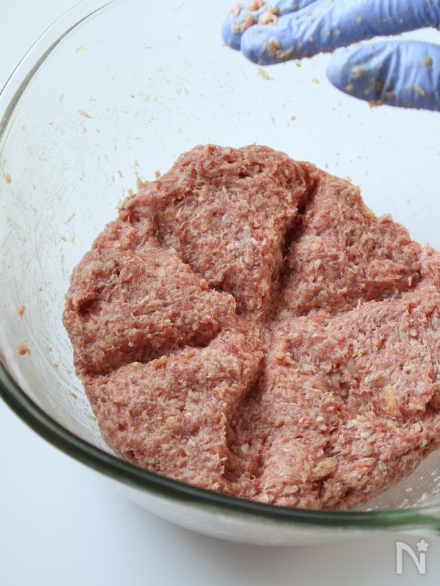 (1) ボウルに合いびき肉と玉ねぎ【A】を加え、ひとまとまりになるまでこねる。