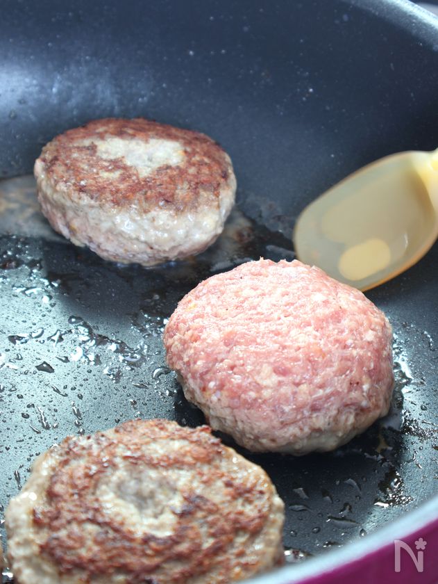 ※ハンバーグを作る時のひき肉は脂身が多いものを選ぶのがワタシ流ポイント!お肉からでてきた脂がソースと混ざって濃厚おいしいおソースに仕上がります。