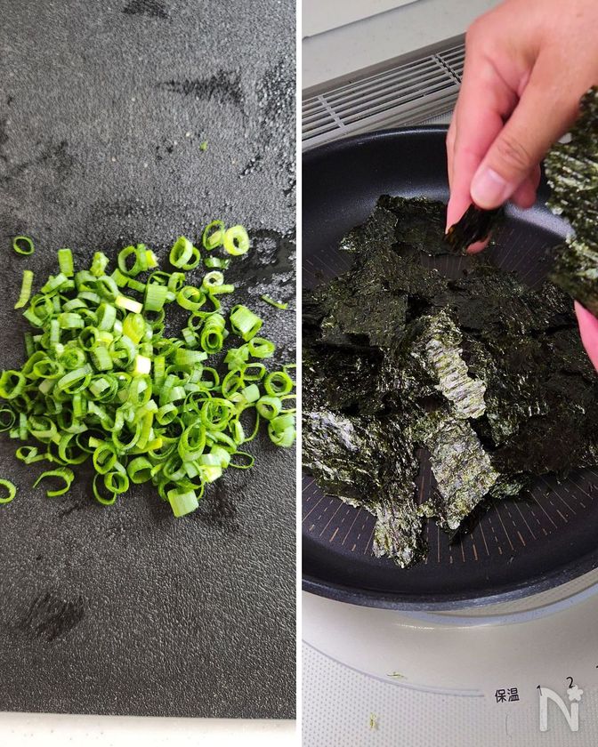 (1) フライパンに焼き海苔(全形)を手でちぎってフライパンに入れる。