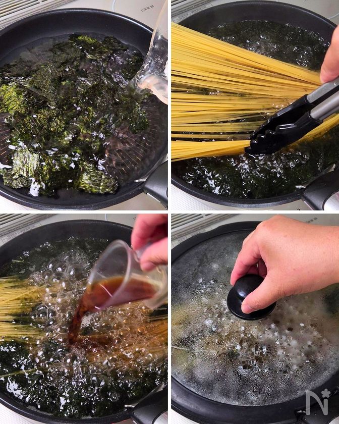 (2) 焼き海苔の入ったフライパンに水を入れて火にかけて沸騰したらスパゲッティをほぐしながら入れる。