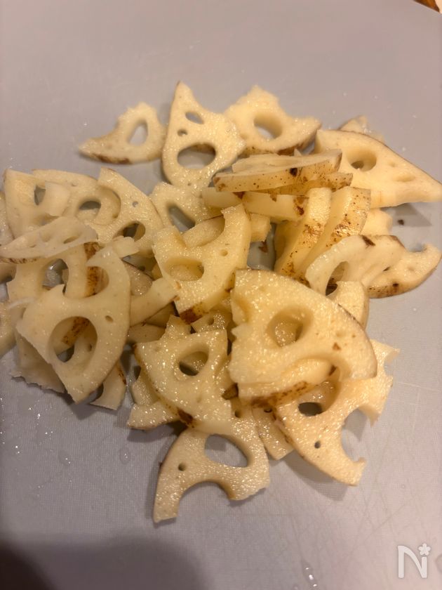(1) レンコンは皮つきのままいちょう切りにする。