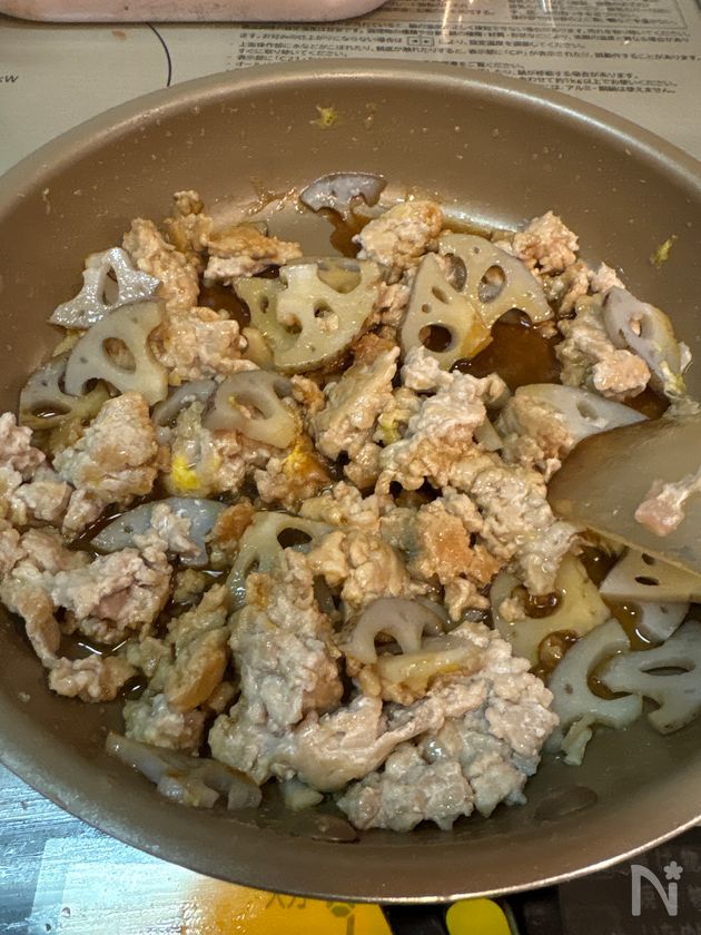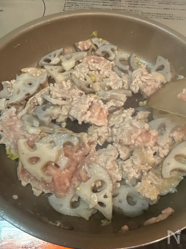 (3) サラダ油(小さじ1)を熱し鶏ひき肉とレンコンを炒める。