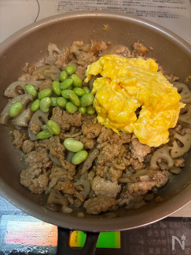 鶏ひき肉と卵とレンコンの甘辛丼