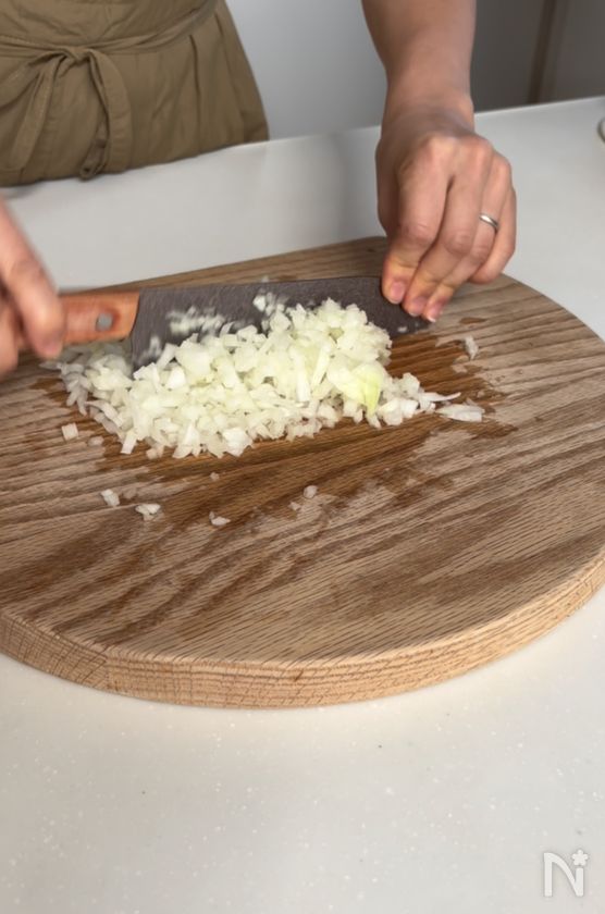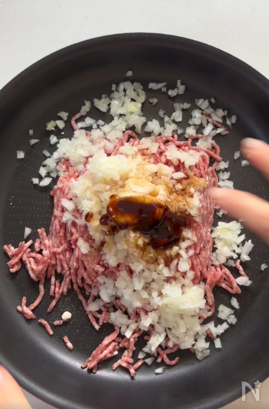 (1) フライパンに豚ひき肉、玉ねぎ、【A】を入れてよく混ぜる。