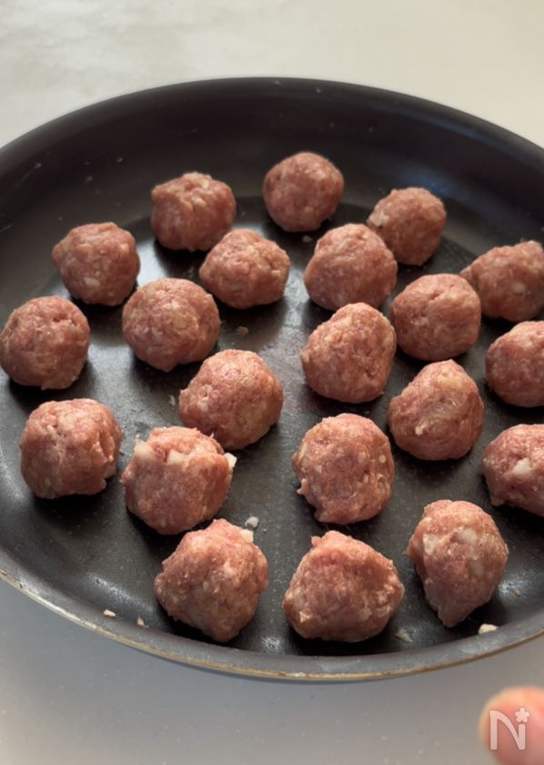 (2) 20等分になるように肉を丸め、少し隙間を空けて並べる。