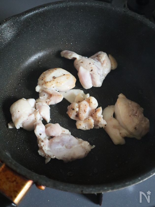 (2) 深めのフライパンにバターを熱し、鶏もも肉を弱火で焼いていく。両面に焼き色をつけたら皿などに取り出しておく。