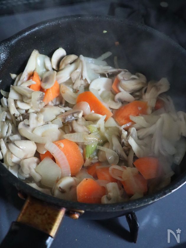 (4) 玉ねぎが透き通ってきたら人参、マッシュルーム、舞茸を入れて炒める。最後にかぼちゃを加えて炒める。
