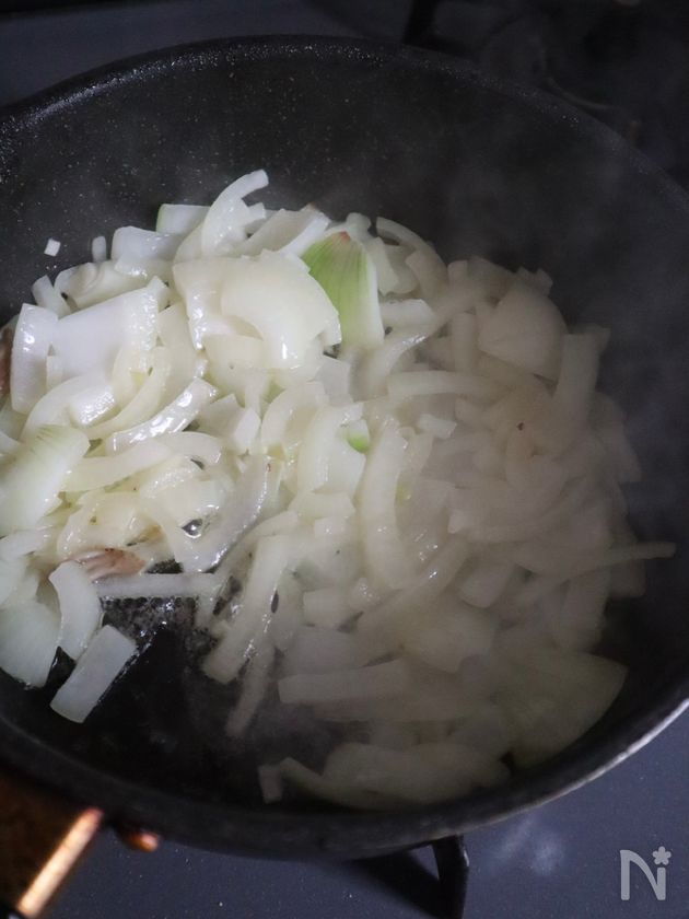 (3) 同じフライパンで玉ねぎを弱火で炒める。