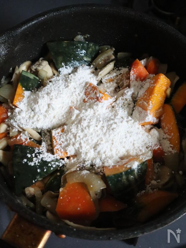 (5) 野菜類に火が通ったら小麦粉を一度に加えて全体がなじむまで炒める。