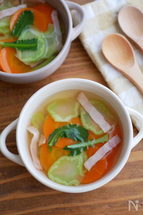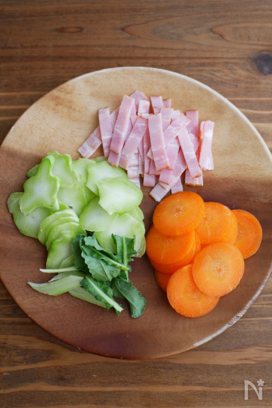 (1) ブロッコリーの茎とにんじんは皮ごと厚さ2〜3mmのうすい輪切りにする。ベーコンは1cm幅に切る。