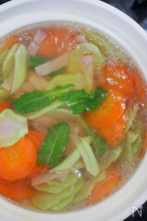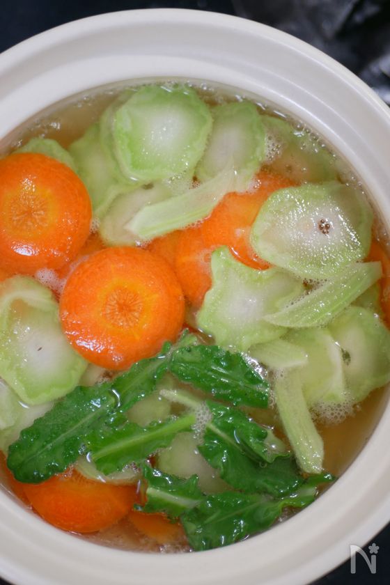(4) 野菜がやわらかくなったら、火を止め、器に盛っていただく。