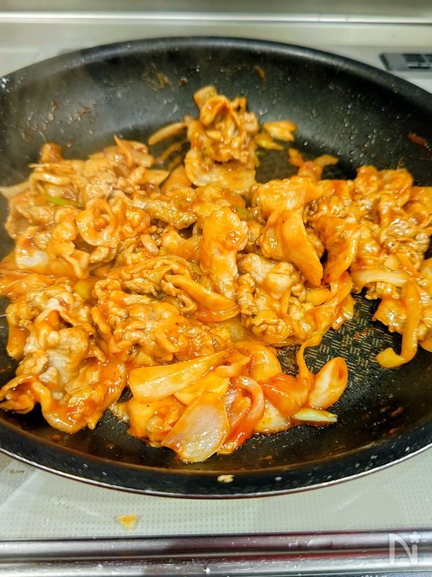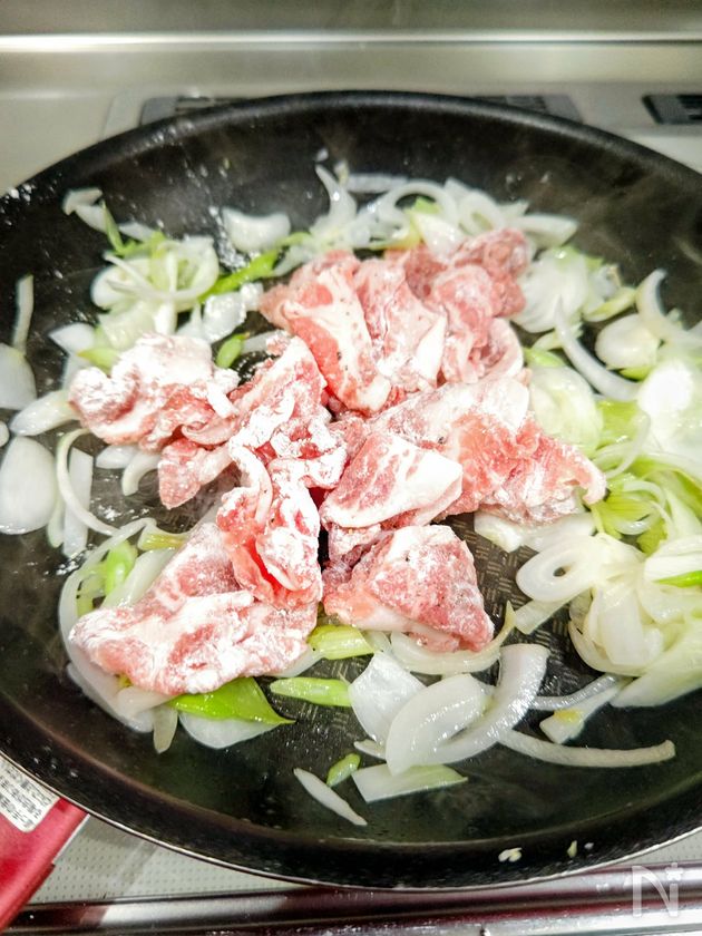 玉ねぎがしんなりしたら、豚ロース肉に小麦粉をしっかりまぶして、フライパンに加え焼いていく。