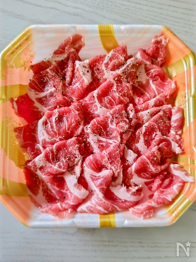 (1) 豚ロース肉しゃぶしゃぶ用に塩コショウを軽く振りもみこんでおく。