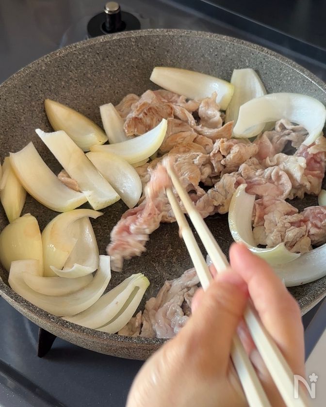 (2) フライパンにサラダ油をひき中火で熱し、豚こま肉を入れて色が変わってくるまで炒める。
