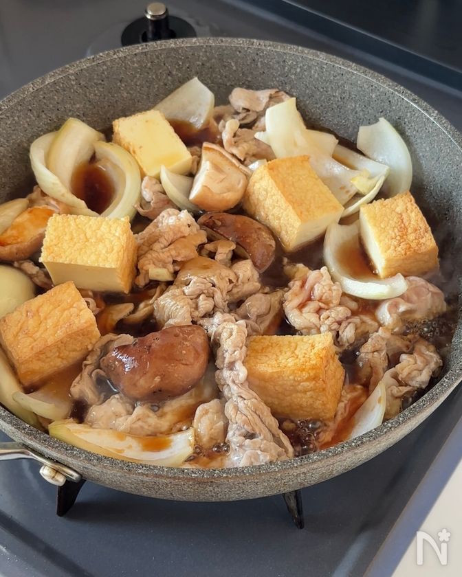(3) ①の椎茸、厚揚げ、【A】を加えたら蓋をして、5分ほど蒸し焼きにする。途中、厚揚げなどを裏返し全体に混ぜる。