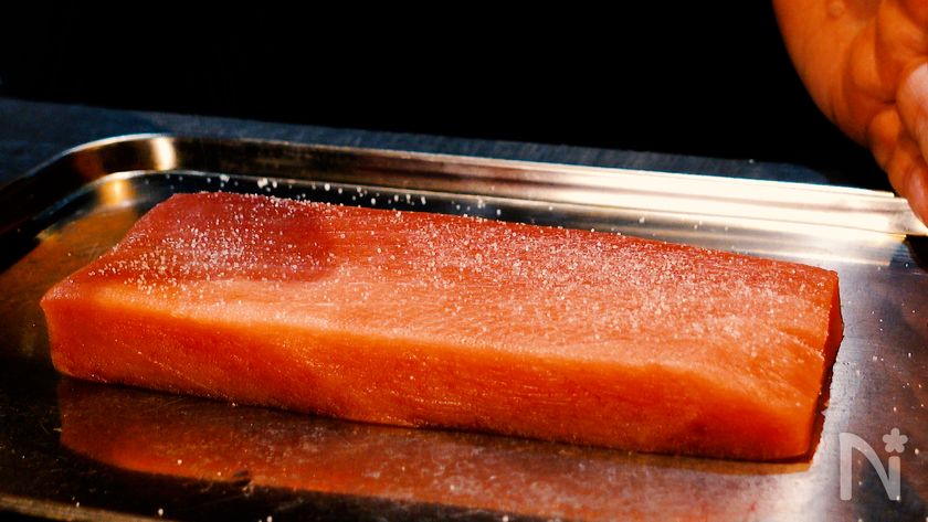 (1) まぐろの柵は水分を拭き取り、両面に塩を1つまみずつふりかけ、冷蔵庫で15分おく。大葉は千切りにする。