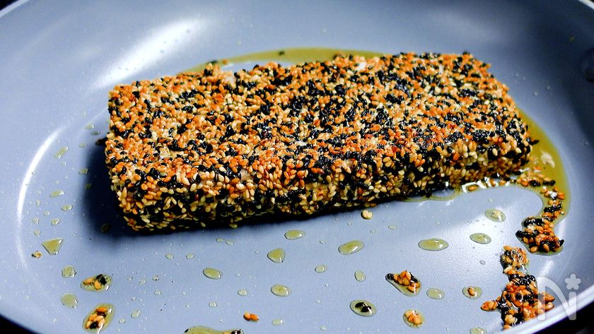 (6) フライパンにごま油をひき中火にかける。フライパンがしっかりと熱くなったらまぐろを入れ、約30秒焼く。ひっくり返し裏も30秒焼き、いい焼き色がついたら取り出し少し休ませる。