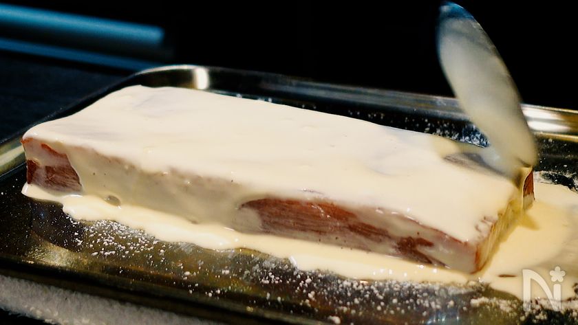 (5) ごまのバットに移し、ごまを全面にまんべんなくつけ、取れないように手でかるく押さえる。