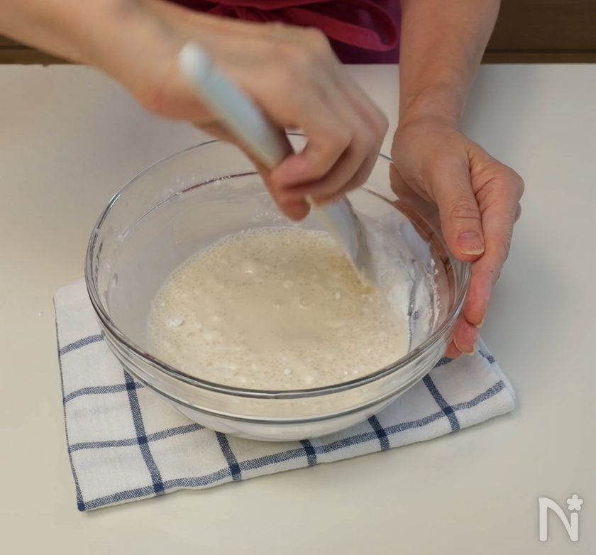 (1) ボウルに【A】を入れ30秒程度混ぜ、酵母をよく溶かす。豆乳は調整水として少し残して加える。