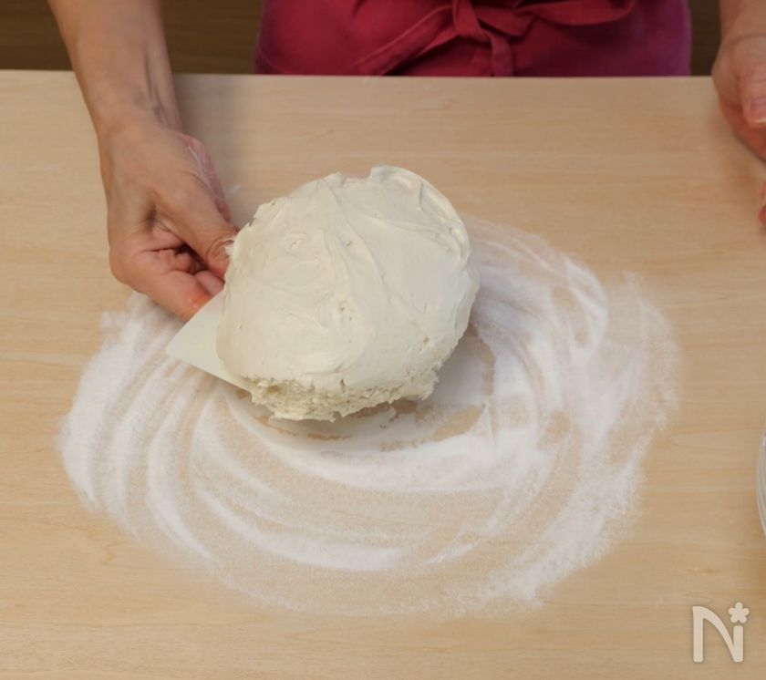 1.5倍程度に膨らんだら、濡らしたカードで、打ち粉した台に、やさしく生地をとり出す。