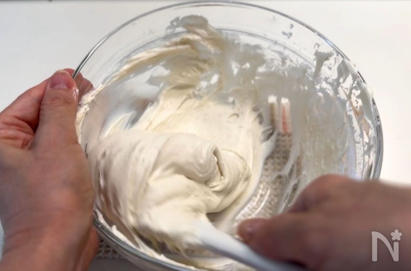 ①に加えゴムベラで手早く混ぜる。生地の固さを見ながら調整水として残しておいた豆乳を加える。(生地が上に積み重なる程度の固さにする。)ゴムベラで1分間混ぜて生地をなめらかにする。