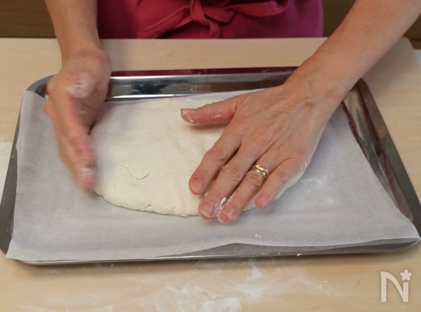 (6) 指で穴をあけ、豆乳を塗り、ハーブソルトや好みで粉チーズをふり、焼く。ステンレスやホーローのバットにのせておく。
