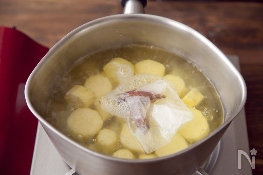 (2) 鍋にさつまいも(金時芋)、くちなしの袋、水2カップを入れて強めの中火にかける。