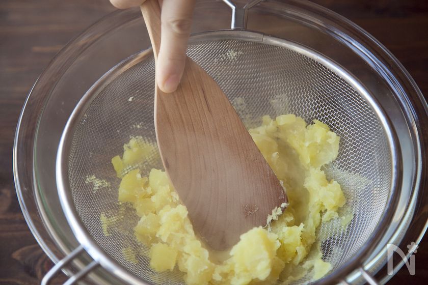 (3) 残りのさつまいもはさらに3分煮て、ここで一度ざるに上げ、鍋に残ったゆで汁はすべて捨ててください。ざるを使って裏ごしする。