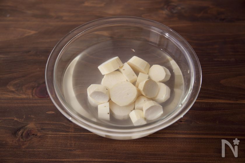 (1) さつまいもは厚さ2cmの輪切りにして皮をむき、水にさらす。