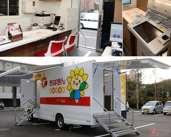 千葉銀行が移動店舗車を導入したのは2021年2月のこと。千葉銀行の車両は、3.5tトラックがベースで、ATMと窓口機能を搭載、入出金や振込みのほか、口座開設や税金の納付、公共料金の支払いなど幅広い業務が行えるのが特徴です。
