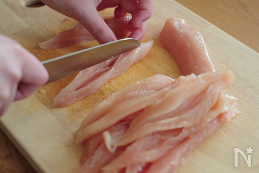 (1) 鶏ささみは縦半分に切って筋を取り除き、観音開きにする。