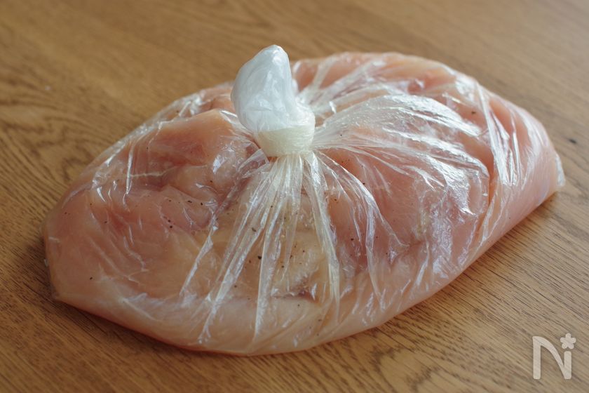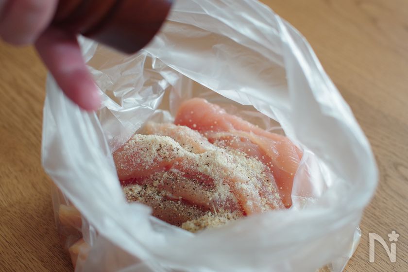 (2) ポリ袋にささみ、【A】を加えてもみ込む。