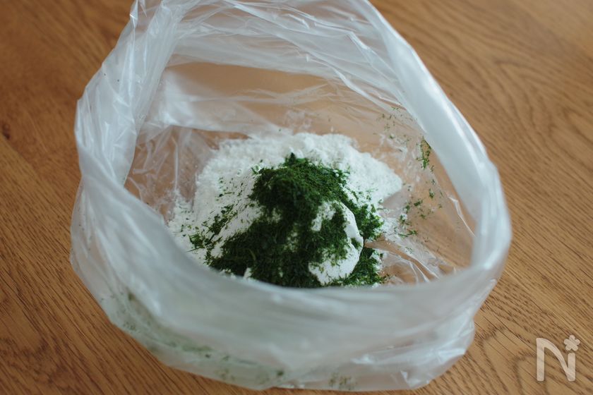 (4) ポリ袋に【B】を合わせて、鶏ささみを入れ衣を全体にまぶす。