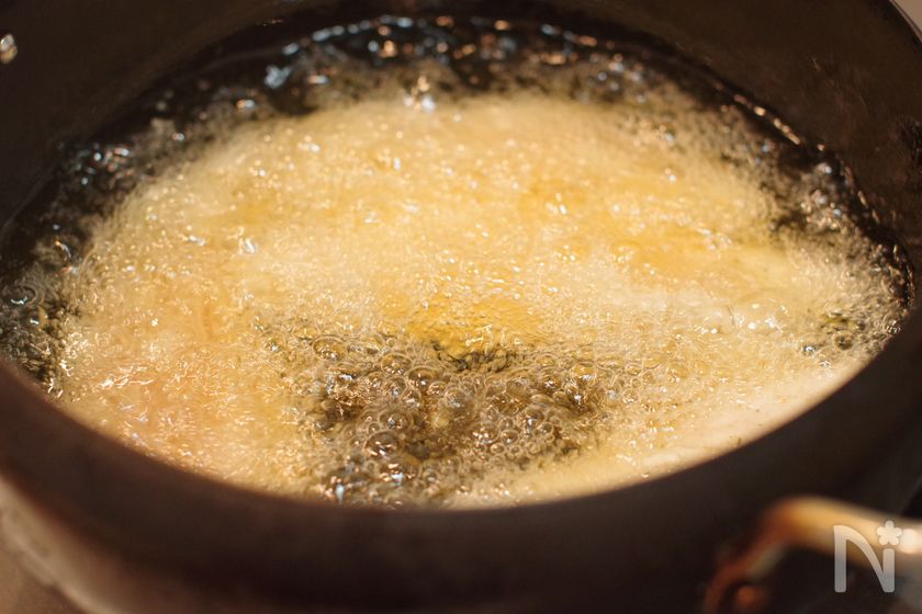 (5) 170℃の油でこんがり色がつくまで揚げる。(目安:3分)ささみを取り出し、3分ほど置いて予熱で中まで火を通す。180℃に熱して1分揚げる。