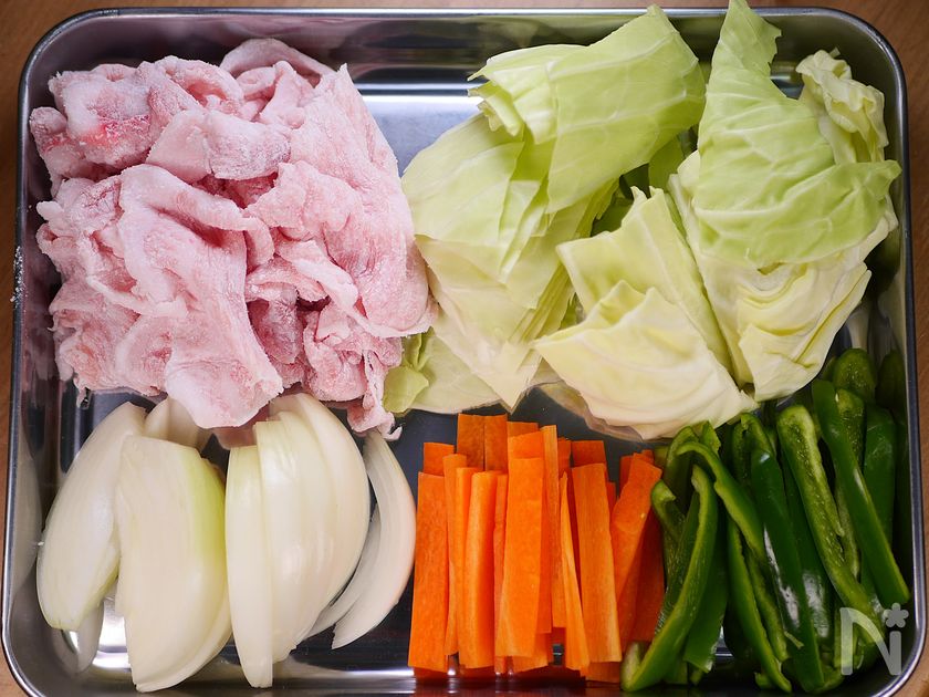 ○玉ねぎは1㎝幅のくし形切り、キャベツはざく切り、にんじんは短冊切り、ピーマンは縦の細切りにする。