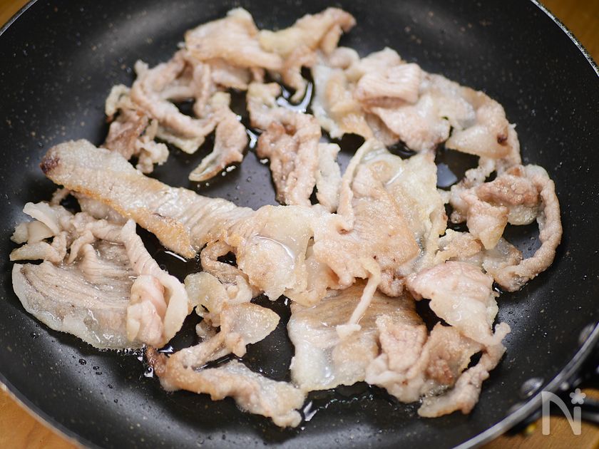 (3) ○フライパンに豚肉とサラダ油(大さじ1、分量外)を入れ、強めの中火で片面焼き色を付けて9割火を通す。