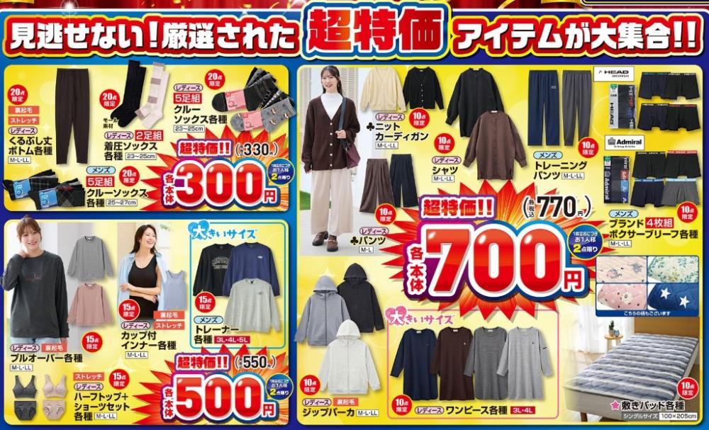 10点限定の「ニットカーディガン」や「ジップパーカ」、大きいサイズの「ワンピース各種」など、秋冬のコーディネートに欠かせないカジュアルアイテムも770円と大特価。