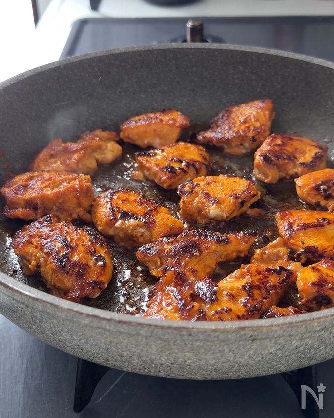 ・鶏肉は焦げつきやすいので、火加減を調節して焼くようにします。